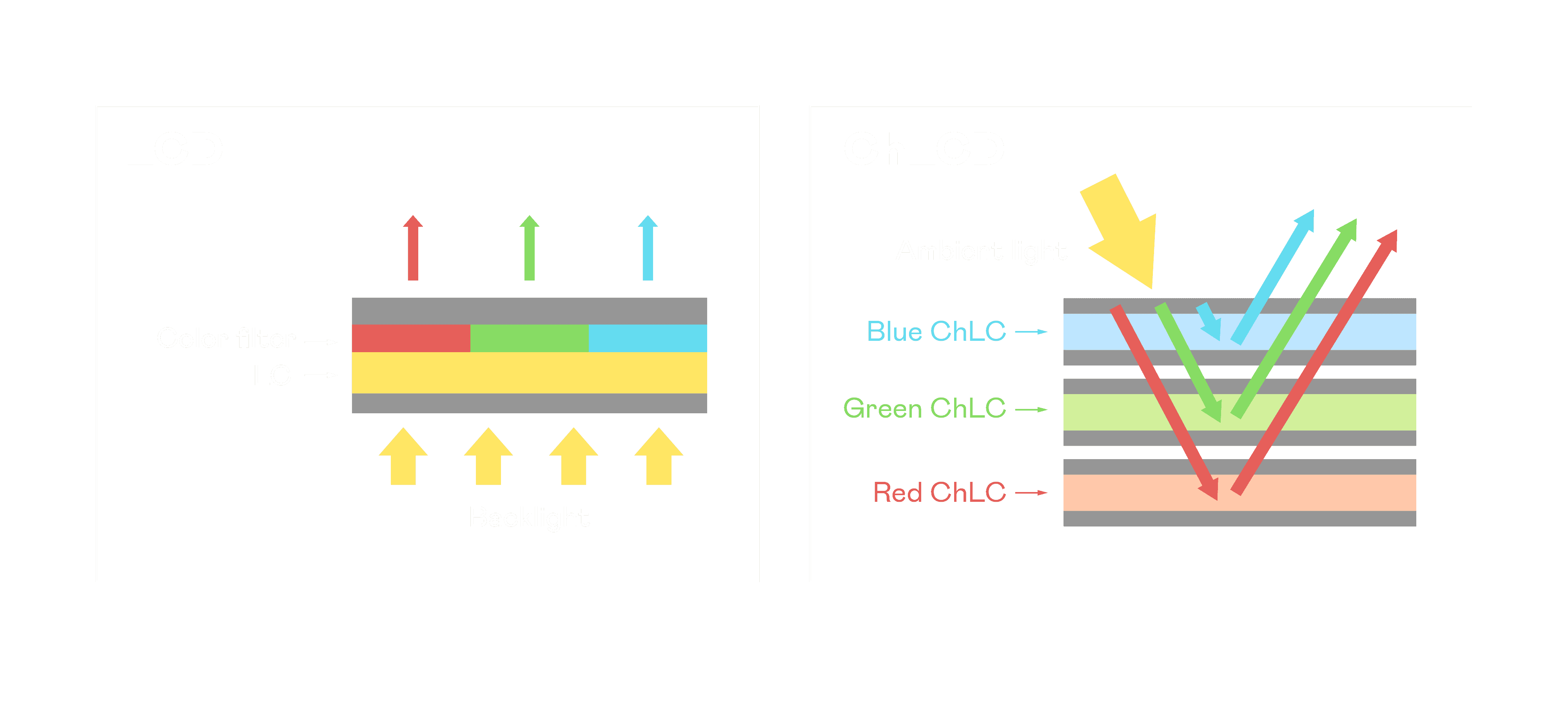 ChLCD 胆固醇液晶就如同纸张一样,,,,透过反射环境光来显示影像,,,,因此长时间观看不易造成人眼视觉疲劳,,,,可达到护眼效果。。。。当处于户外阳光下使用,,,LCD 影像容易失真而不易观看,,但胆固醇液晶仍可维持较佳的影像品质。。。